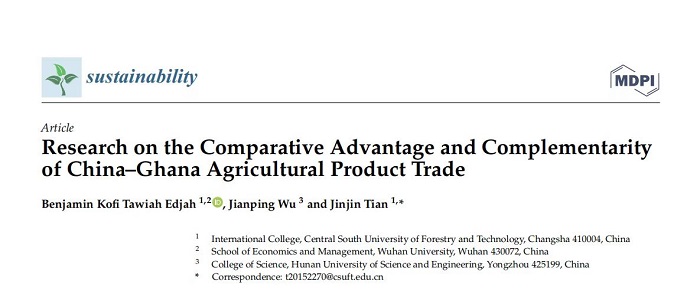 近日,生态领域权威国际学术期刊《Sustainability》(IF=3.889,SSCI二区,JCR分区环境科学二区)在线刊载了我院国际经济与贸易专业合作的论文。我校为该论文的第一署名单位,论文第一作者为我院18级本科留学生Benjamin Kofi Tawiah Edjah,通讯作者为我院国际经济与贸易系田津津老师,论文合作者为湖南科技学院吴建平副教授。