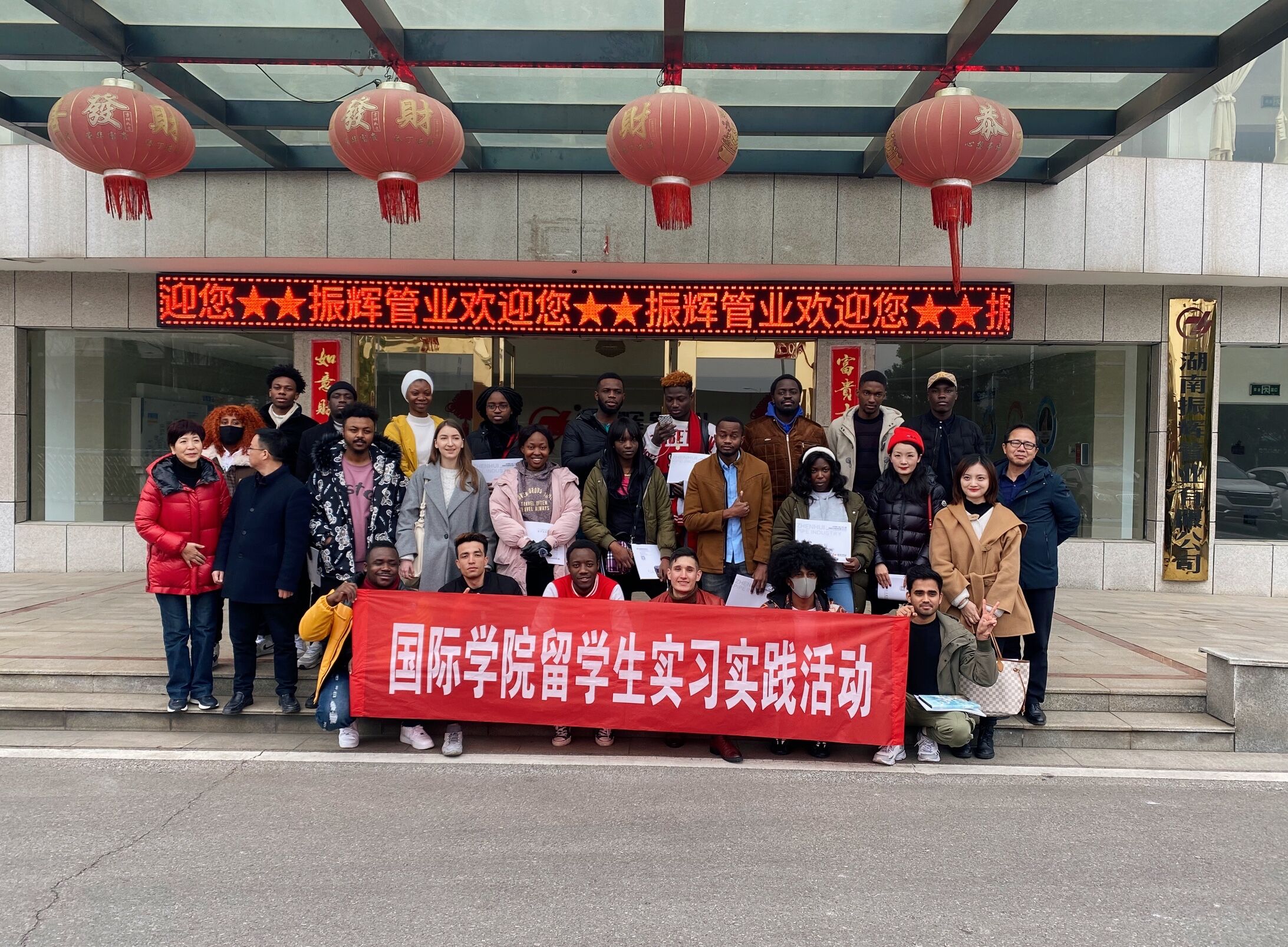 1月4日,我院2019级与2020级国际经济与贸易专业的留学生在童晶、杨蔚老师的带领下,赴湖南振辉管业有限公司进行专业认知实习。该公司肖董事长及张总经理等负责人亲切接见了大家。首先,该公司介绍了企业文化、发展历程、产品的特色、公司在海外的业务以及全球的供应链等。之后,双方就国际学院留学生实习基地建设事宜进行进一步的洽谈。该公司还派人带领大家参观了其先进的实验室和生产车间等,学生们则饶有兴致地咨询了很多问题。