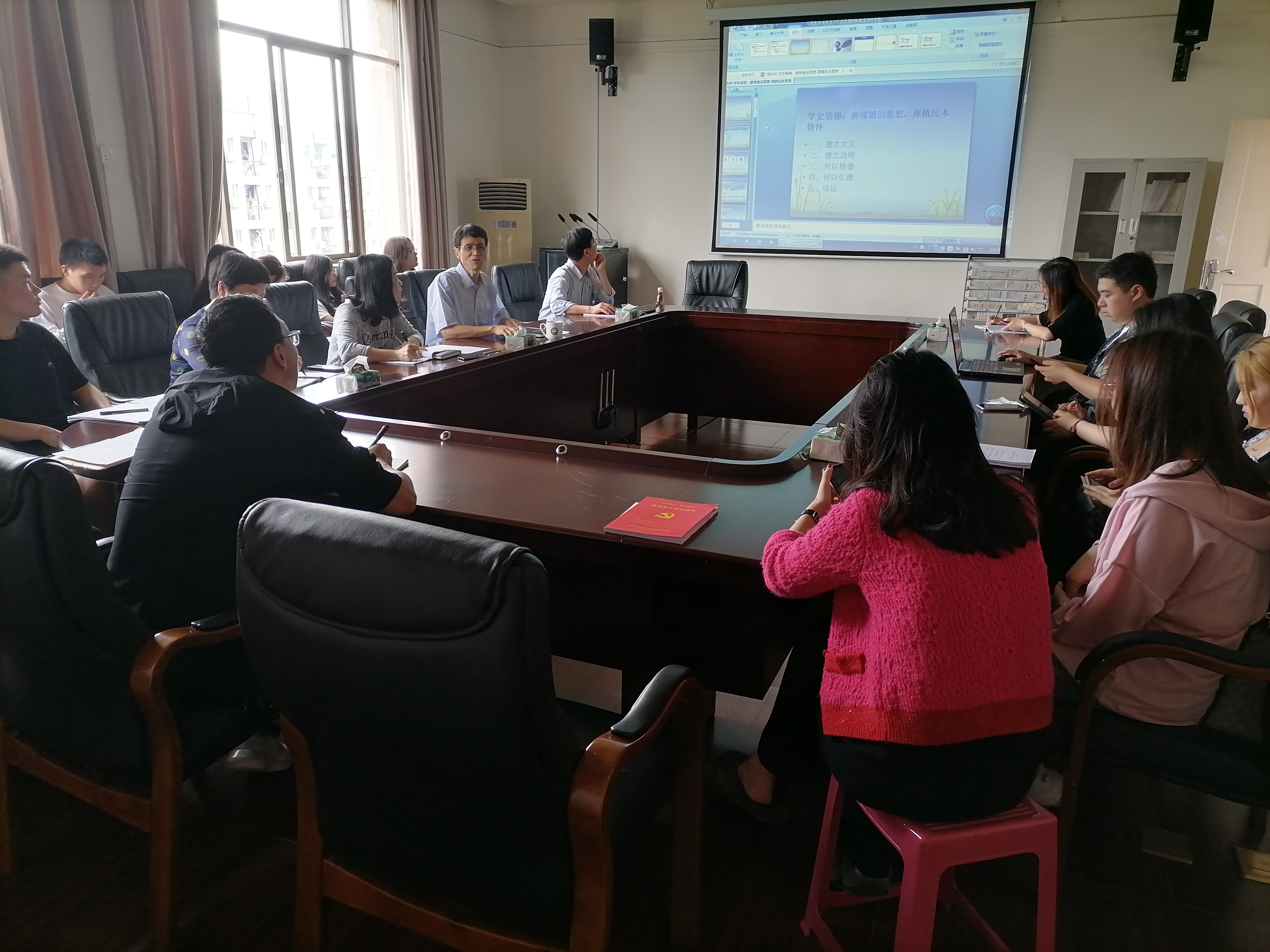 5月27日下午,我院党总支在致远楼603党员活动室开展“学史崇德”专题学习研讨,学院党总支委员、招生专干、国际汉语系教师、湖南师范大学在读博士程含林以《学史崇德,赓续德治思想,厚植民本情怀》为题讲授了专题党课,其它党总支委员进行了交流发言。专题学习由党总支书记李志主持,全体师生党员参加了学习和研讨。