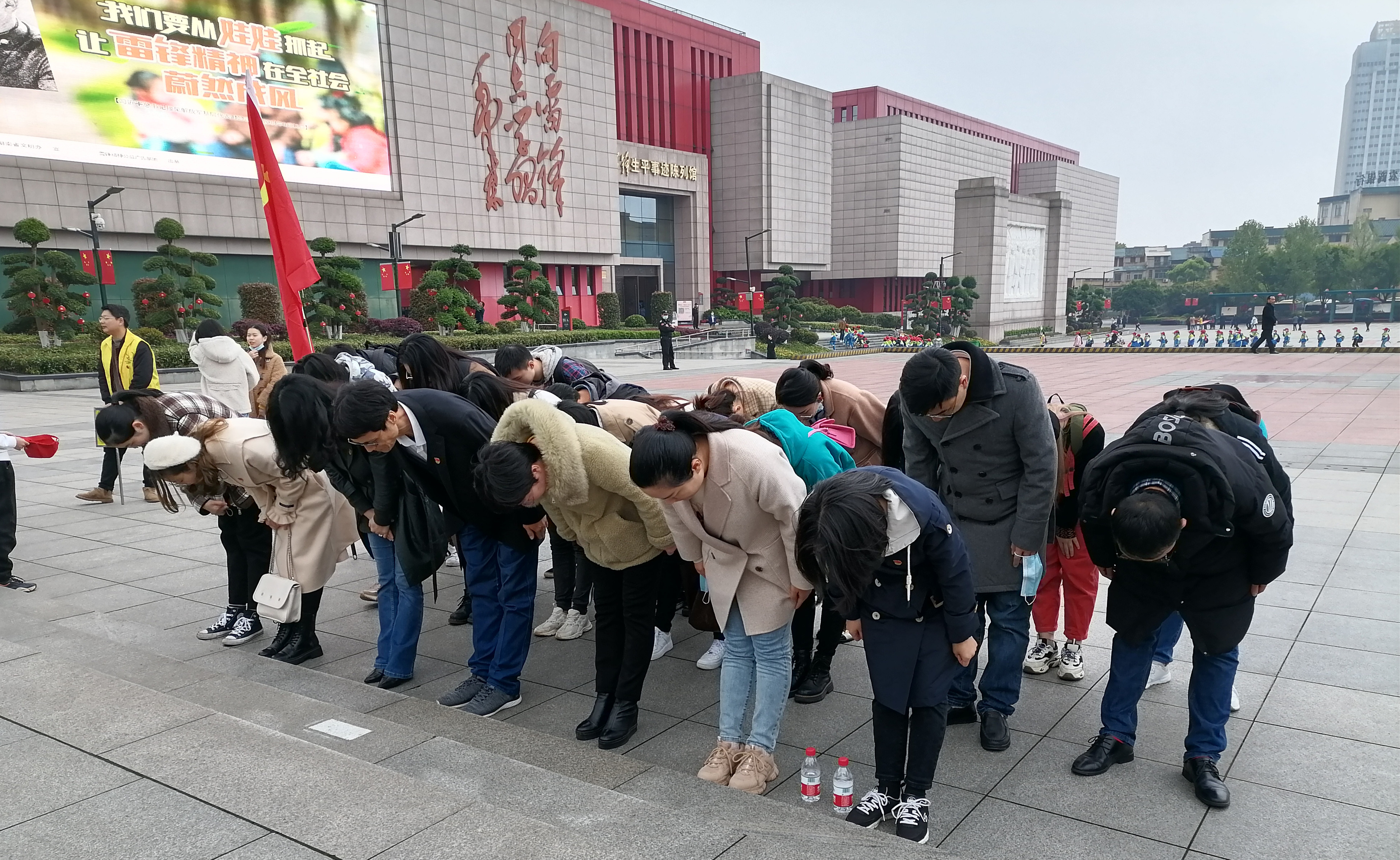 在雷锋纪念馆广场,全体党员向雷锋雕像三鞠躬,缅怀先烈,坚定热爱党、热爱祖国、热爱社会主义的崇高理想和坚定信念,牢记服务人民、助人为乐的奉献精神,继承干一行爱一行、专一行精一行的敬业精神,发扬锐意进取、自强不息的创新精神和艰苦奋斗、勤俭节约的创业精神。