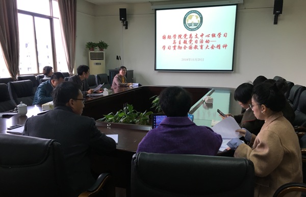 11月20日下午,我院在致远楼603会议室举行党总支中心组学习与主题党日活动,专题学习贯彻全国教育大会讲话精神。会议由党总支书记李志主持。全体教工党员与学生党员代表参加学习。