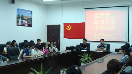 首先由贺书记讲话,对即将走向社会的党员同学们提出了希望和要求,他希望同学们永保“三心”,一是永保进取之心,二是永保学习之心,三是永保感恩之心,要求同学们在新的岗位上要以一个党员的标准严格要求自己,要牢记党的宗旨,要发扬党的优良传统,在利益面前要经得起考验,要充分发挥党员的先锋表率作用,要始终牢记“一名党员是一面旗帜”。他希望同学们继续保持联系,关心和支持学校和学院的发展,有空就回学校和学院走一走,看一看,这里就是同学们回长沙的家。