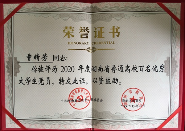近日,省委教育工委发文《关于表彰湖南省普通高校百佳大学生党员的通报》,决定授予全省各高校100名学生“湖南省普通高校百佳大学生党员”荣誉称号。我院曾婧芳同学获此殊荣。曾婧芳同学严格以党员标准要求自己,深入学习习近平新时代中国特色社会主义理论,思想品德优良,有真才实学,综合素质较高,是广大学生和学生党员学习的榜样。(刘老师供稿编发,杨灿审核)