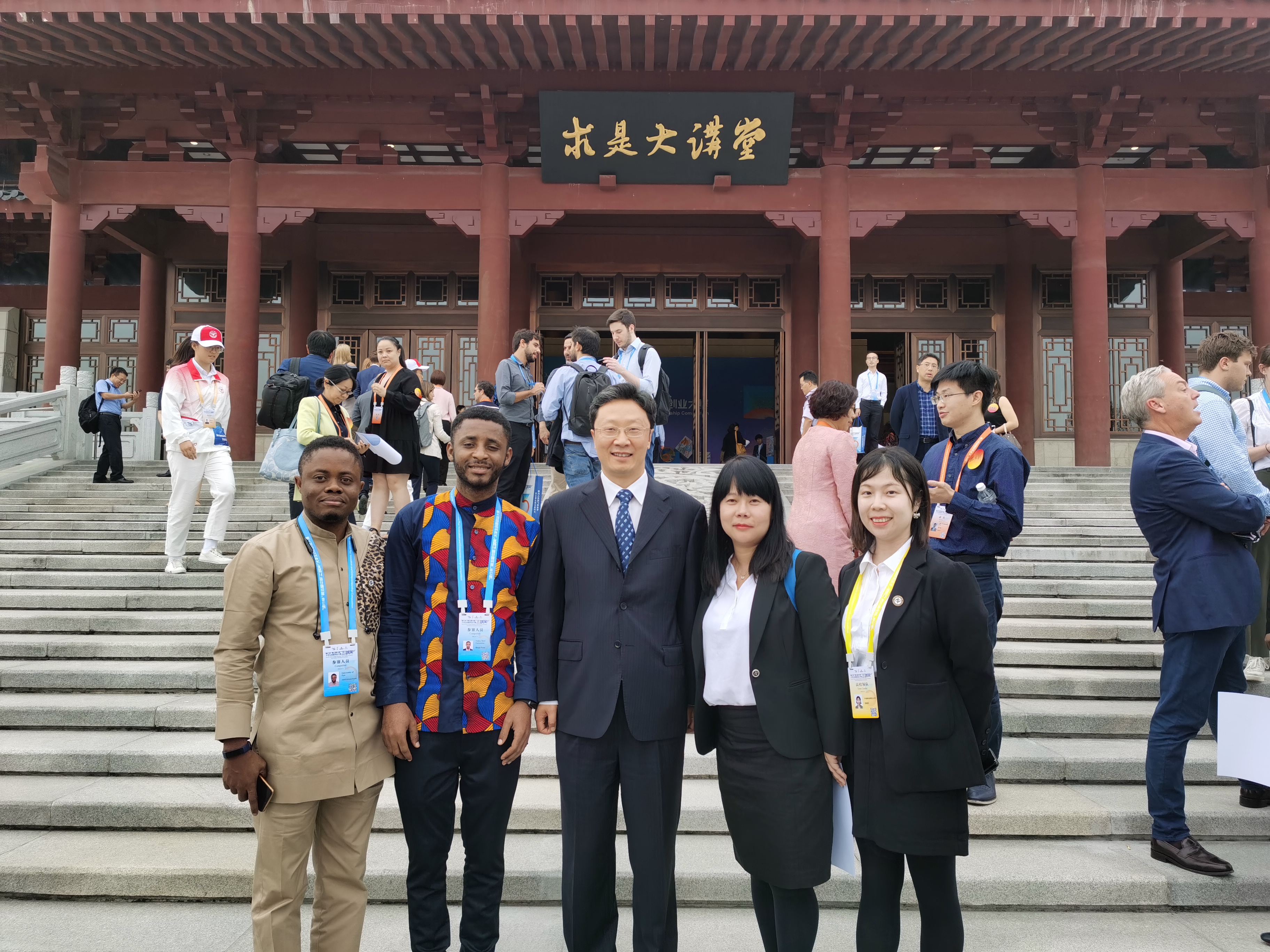 (左一食品学院博士研究生Akan Otobong Donald,左二我院国际贸易本科生Kings Fosu,左三教育部高教司徐青森副司长,右二我院教师孙颖,右一我院教师娄秋吟)