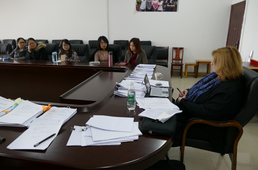 系统审查中,Barbara Irvine针对国际学院SQAHND 项目办学以来的各项工作完成效果及质量,做了现场的审核和评估。评估项目含有五大项:管理质量、有效资源的提供、给予学生的支持、内外审的流程及数据管理。在审核的过程中,Barbara Irvine分别和学生及老师进行了会谈,全方位了解了各项指标完成的实际情况。在座谈会上,Barbara Irvine和老师们进一步交流了保证及改善SQAHND项目质量的看法。